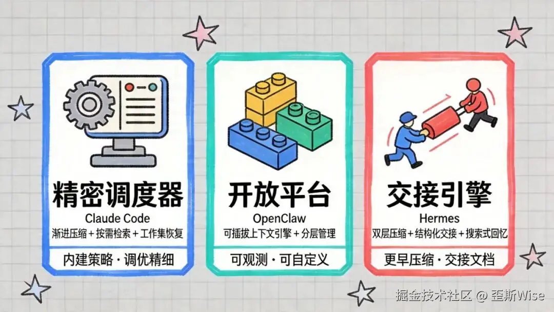 Hermes 最近成为了新的热点,除了自我进化机制,更值得注意的是它在上下文管理上做了不少激进设计,比如更早触发压缩、把摘要做成交接文档。