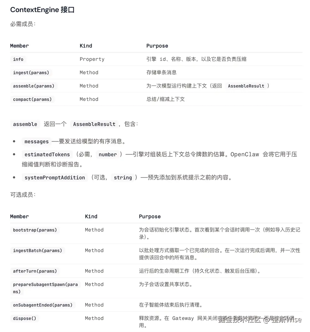 而比较有意思的是 Openclaw 的 context-engine 插件。它是 OpenClaw 里的一个可替换组件,负责决定:每次调用模型时,把哪些历史消息塞进上下文窗口,以及窗口满了怎么压缩。