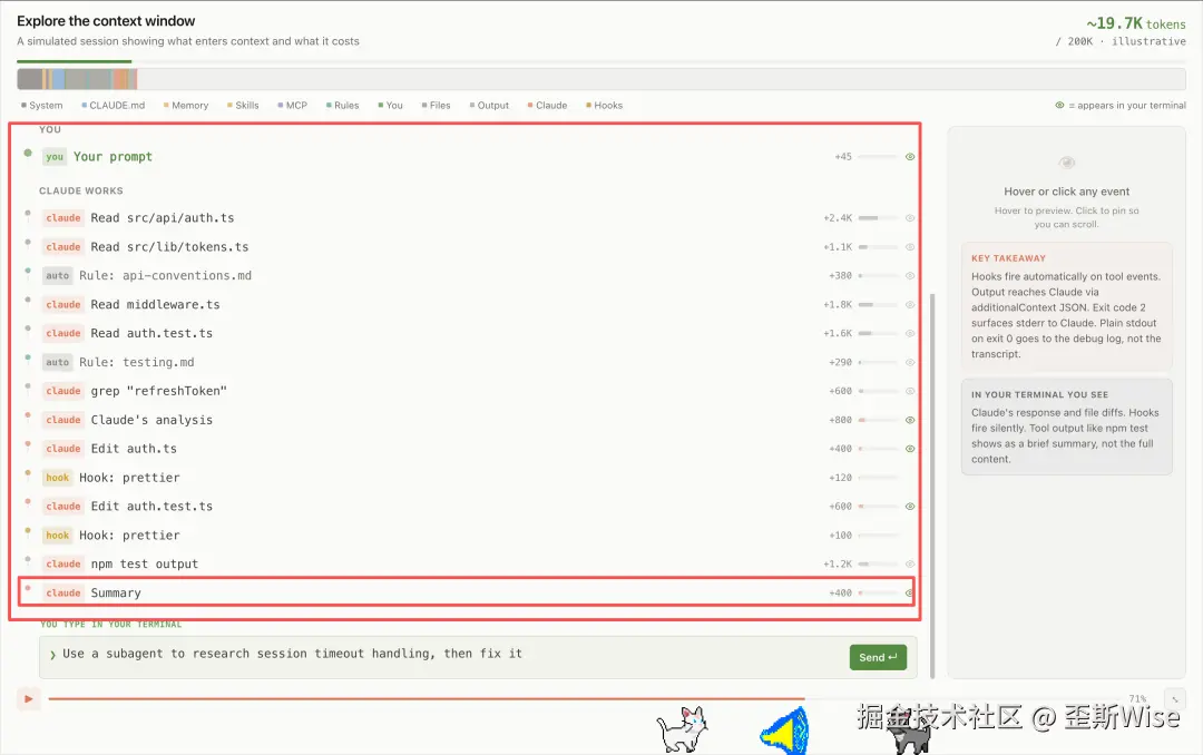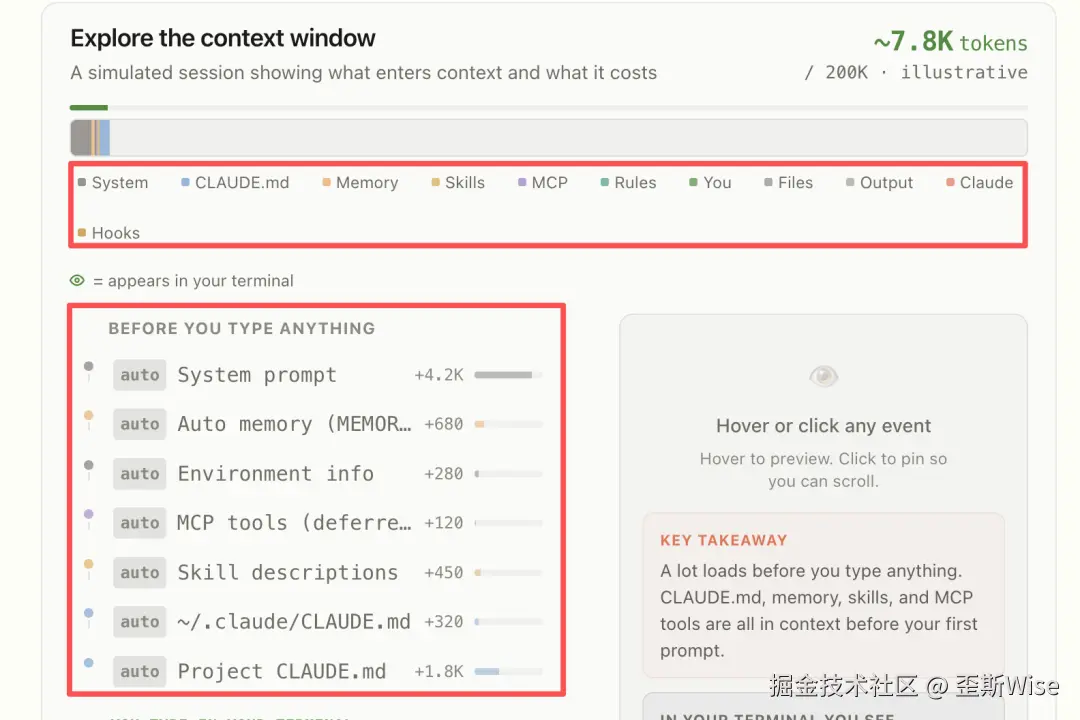 官方的 Explore the context window 可以看到整个过程,在你输入任何事情之前,会开始阅读环境数据、可以用的工具、Skills,项目级的 CLAUDE.md,这些其实已经提前占用了你的上下文窗口。