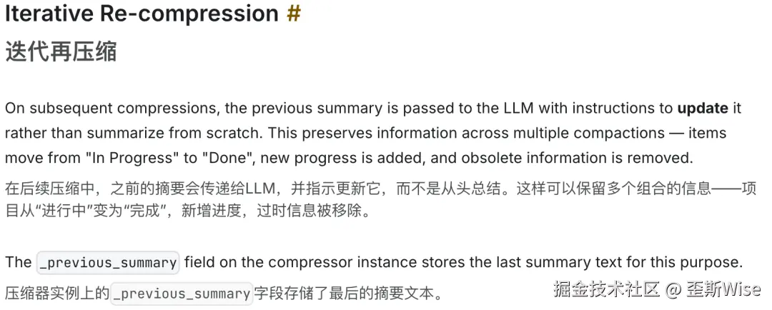 它还支持增量更新:多次压缩后不会从零重新总结,而是在上一次的摘要上追加更新。信息在多次压缩中是递进保持的,而不是每压缩一次丢掉一些信息。