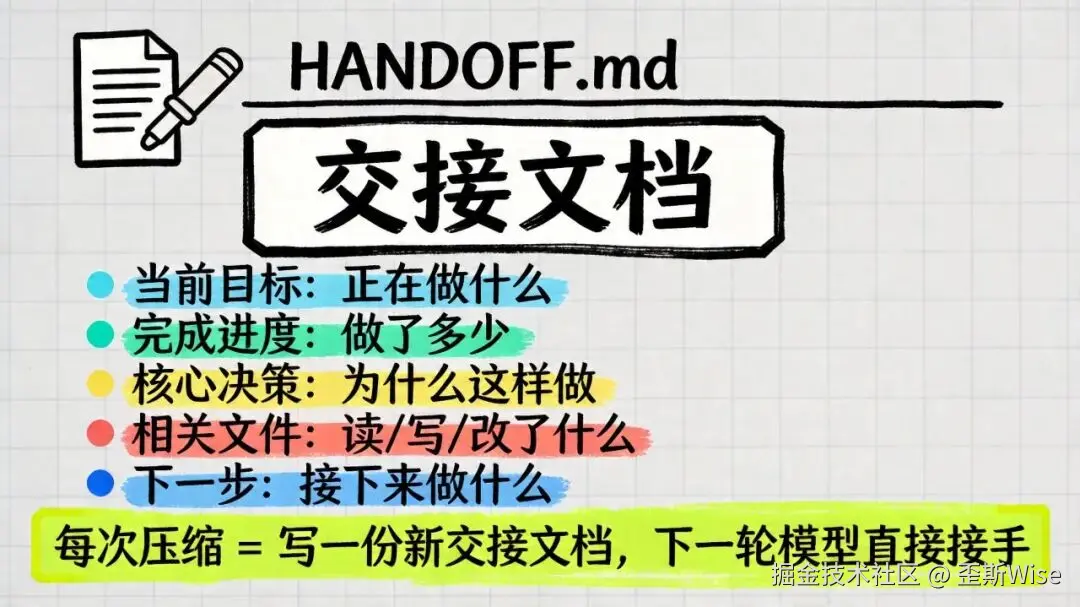 这是 Hermes 设计品味最集中的表现,它不是宽泛的"总结一下之前做了什么",下一个窗口 AI 可以基于交接文档快速的接收工作。