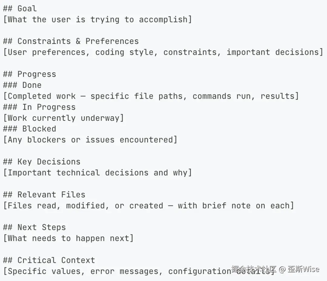 但最重要的地方在于它会生成结构化的摘要,它把压缩的摘要当成了交接文件。