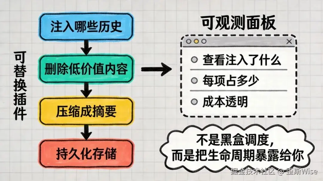 你可以自己选择什么信息要存储、什么时候压缩,以及上下文要按照什么结构梳理,还可以调整需要构建的上下文。