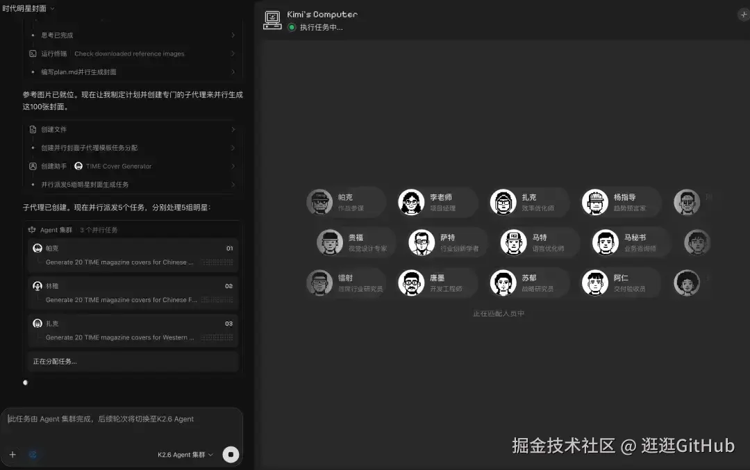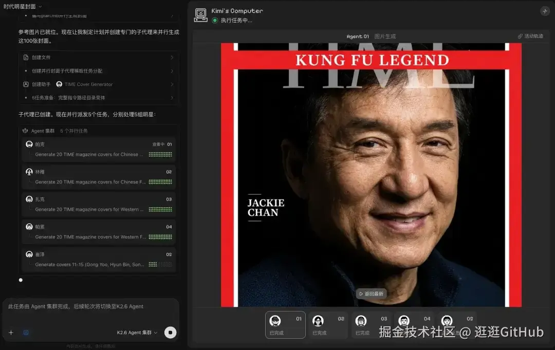 然后打开 Agent 集群模式,基于刚刚提取的 time-magazin-cover 的 skill 去批量生成大量明星的时代周刊封面。