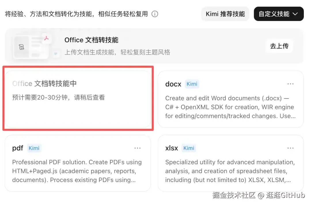 Kimi 的技能推出了一个新的能力, 和 Agent 集群模式配合简直是绝配。