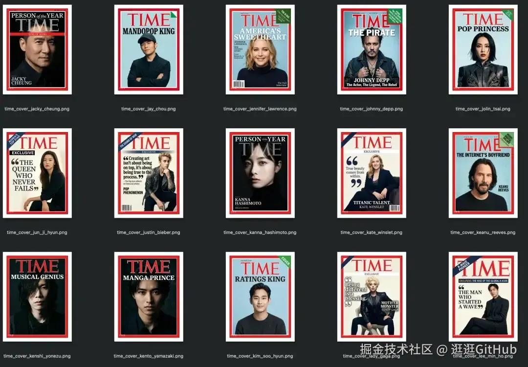最终, Agent 集群高效率、高质量的生成了 100 个明星的时代杂志封面,效果非常不错。