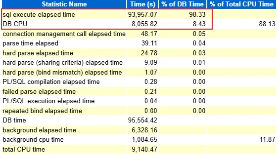 Time Model 分析显示 sql execute elapsed time 占 DB Time 的 98.33%,而 DB CPU 仅占 8.43%,进一步证实性能瓶颈主要在 I/O 等待: