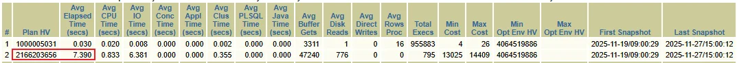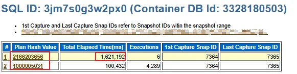 通过 AWR SQL 报告分析,可以发现该 SQL 存在两个执行计划: