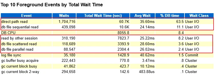 Top Event 中 direct path read 等待事件占比 63.5%,总等待时间 60,694 秒,平均每次等待 35.60 ms,远超 10ms 的健康标准:
