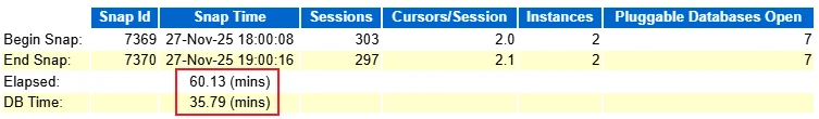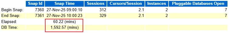 报告采集时间范围为 60 分钟,DB Time 高达 1,592.57 分钟,平均活动会话数(Avg Active Sessions)达到 23.6,表明数据库在此期间承受了巨大的性能压力: