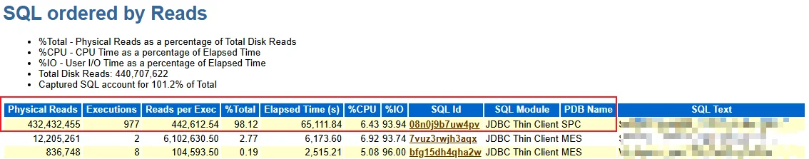 进一步分析发现,SQL ID 为 08n0j9b7uw4pv 的语句物理读高达 4.32 亿次,占总量的 98.12%,执行频繁且主要等待事件为直接路径读,表明该 SQL 对大表进行了大量全表扫描操作,是系统最主要的性能瓶颈: