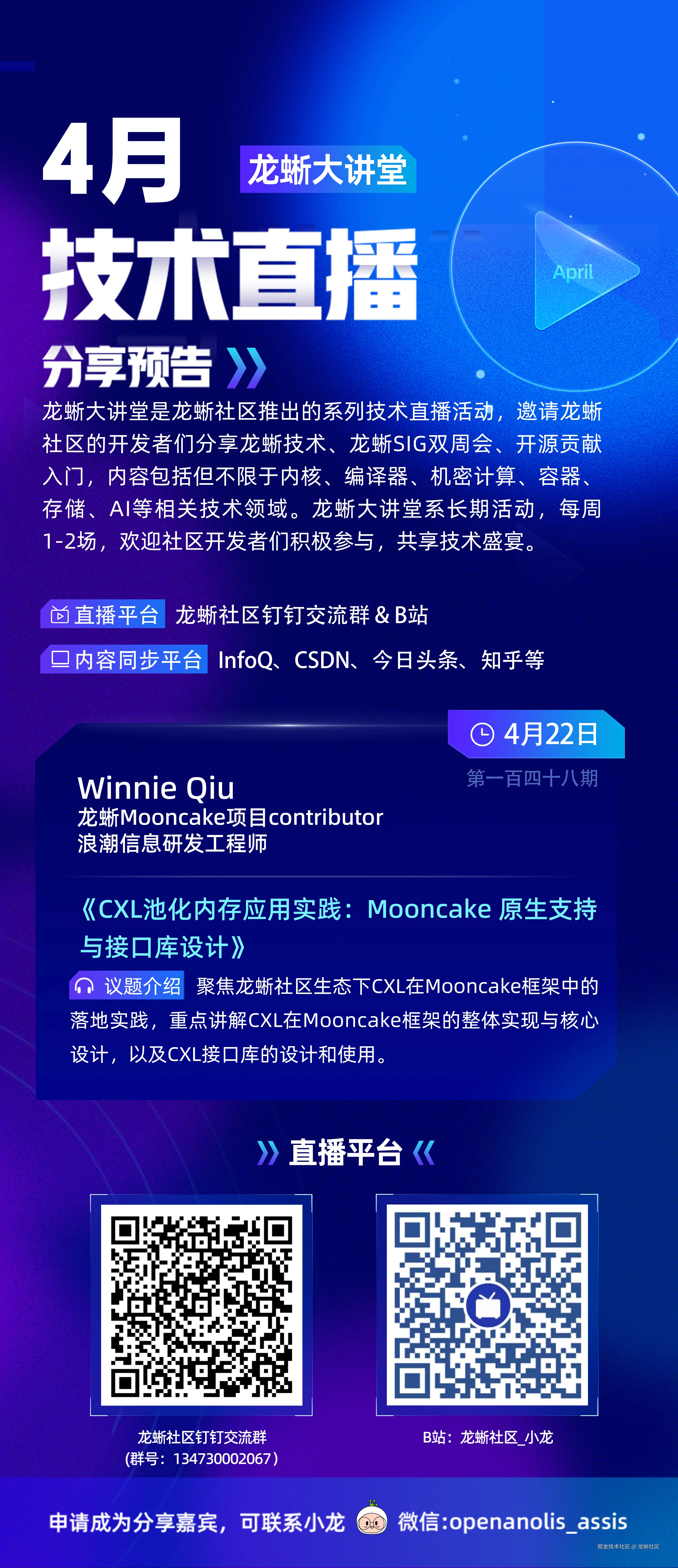 本次直播聚焦龙蜥生态下 CXL 在 Mooncake 框架的落地实践,重点讲解 CXL 在 Mooncake 框架的整体实现与核心设计、以及 CXL 接口库的设计和使用。