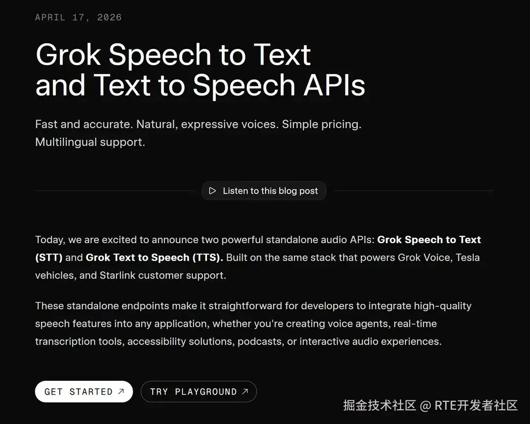 xAI 宣布推出独立的音频处理接口 Grok Speech to Text (STT) 与 Text to Speech (TTS),该技术栈此前已在 Tesla 车载语音和 Starlink 客户支持系统中验证。开发者现可通过 REST 或 WebSocket 接入,以极低成本实现毫秒级延迟的语音识别与合成。