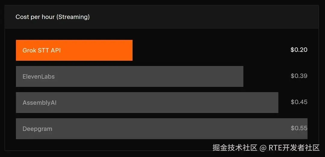 激进的价格策略:批量 STT 定价 0.20/小时。对比行业主流竞品(如 Deepgram 批量 0.55/小时),其使用成本降低了约 60%-70%。