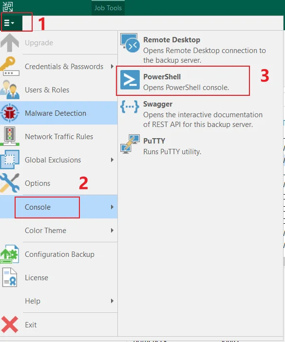 打开 Veeam Backup & Replication 控制台,点击左上角的“菜单”按钮,选择“PowerShell 界面”: