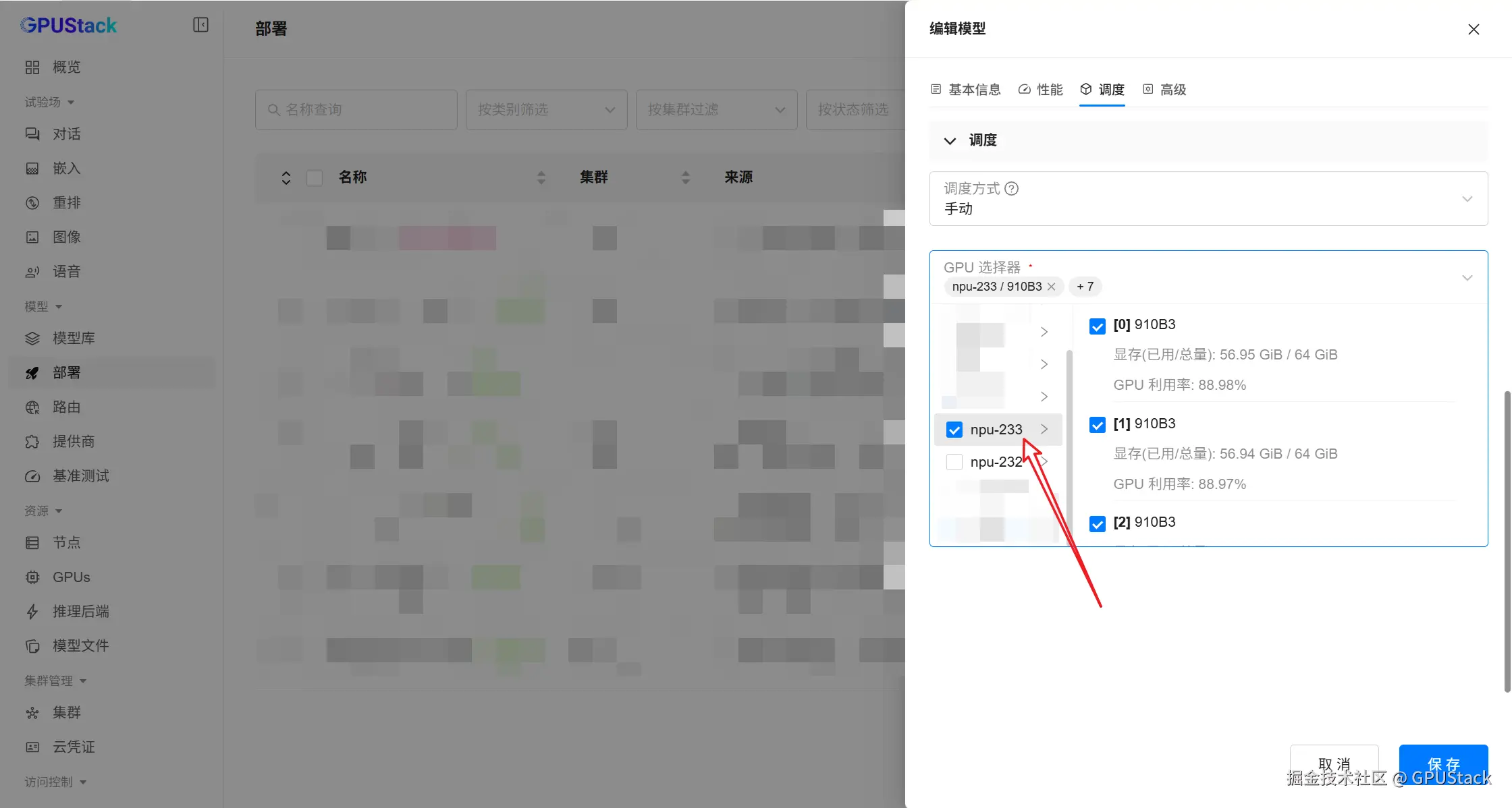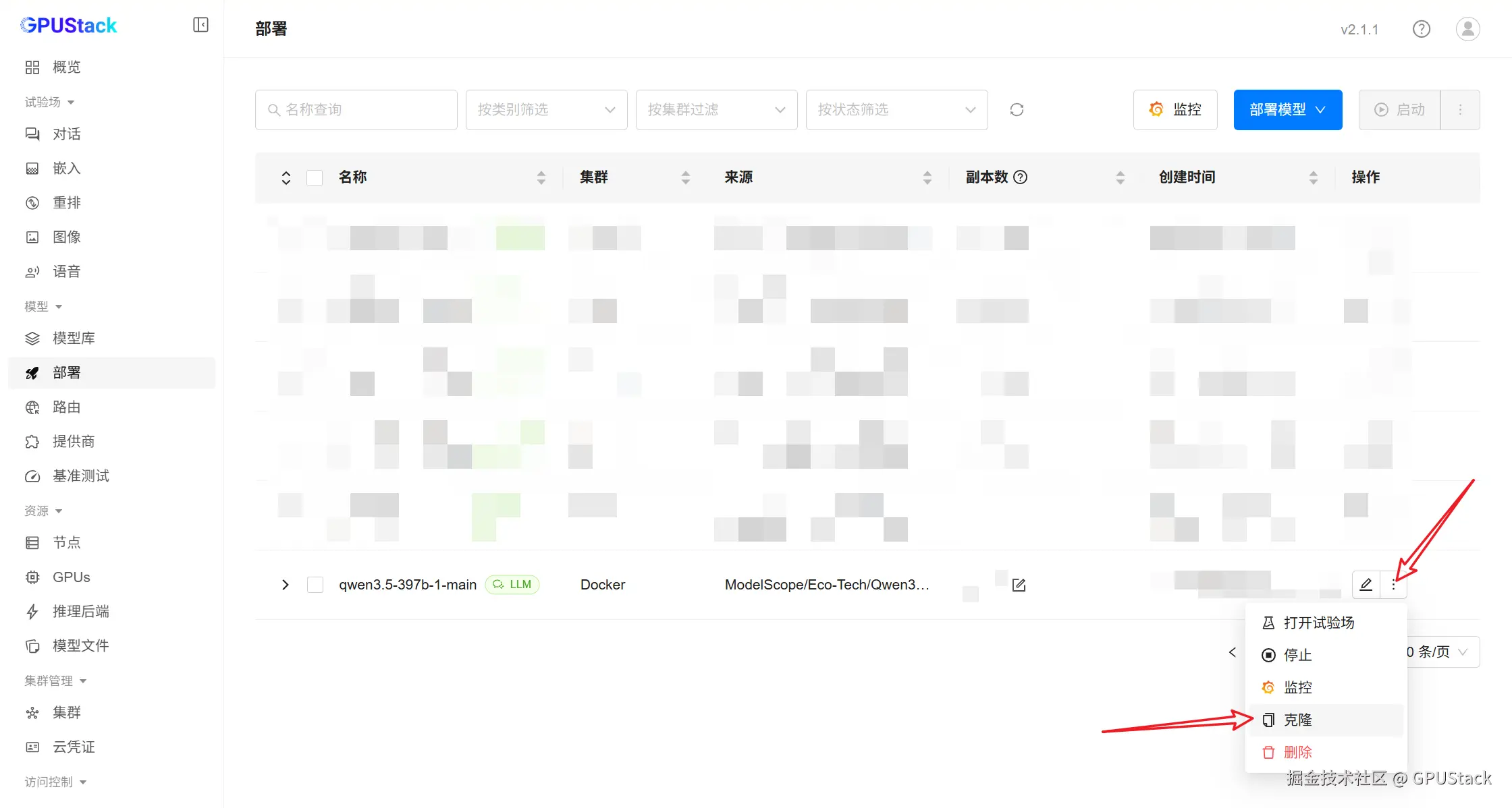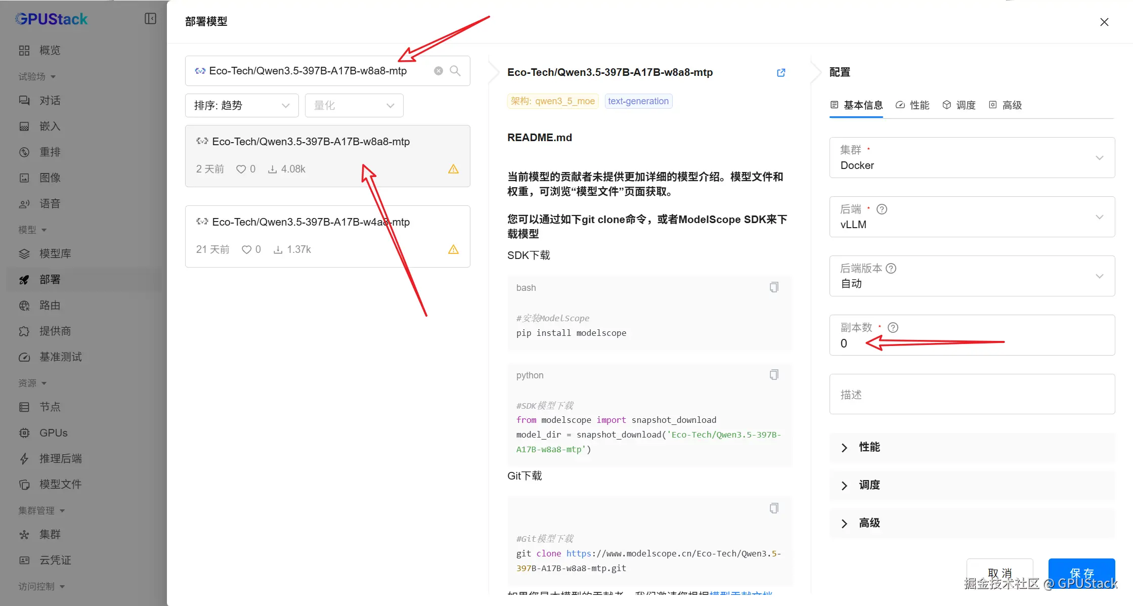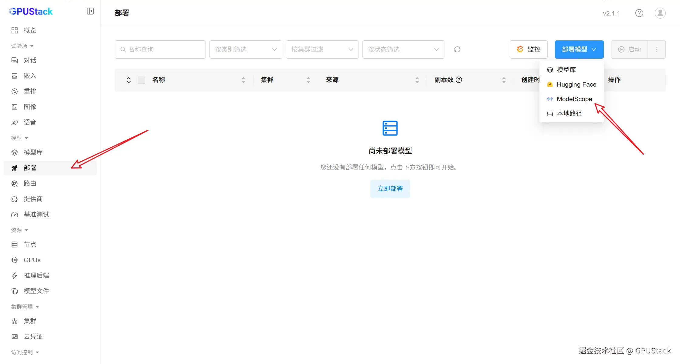 - 在 GPUStack 部署页面,展开部署菜单,选择 ModelScope