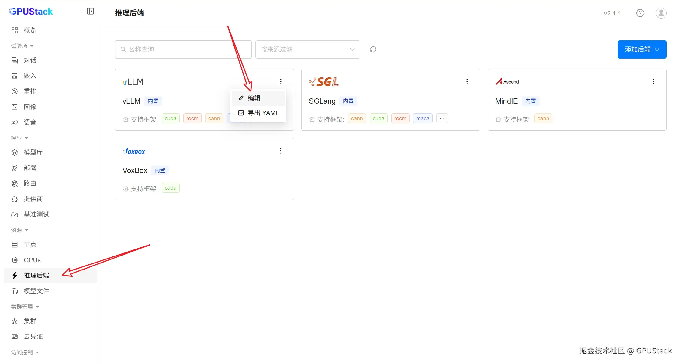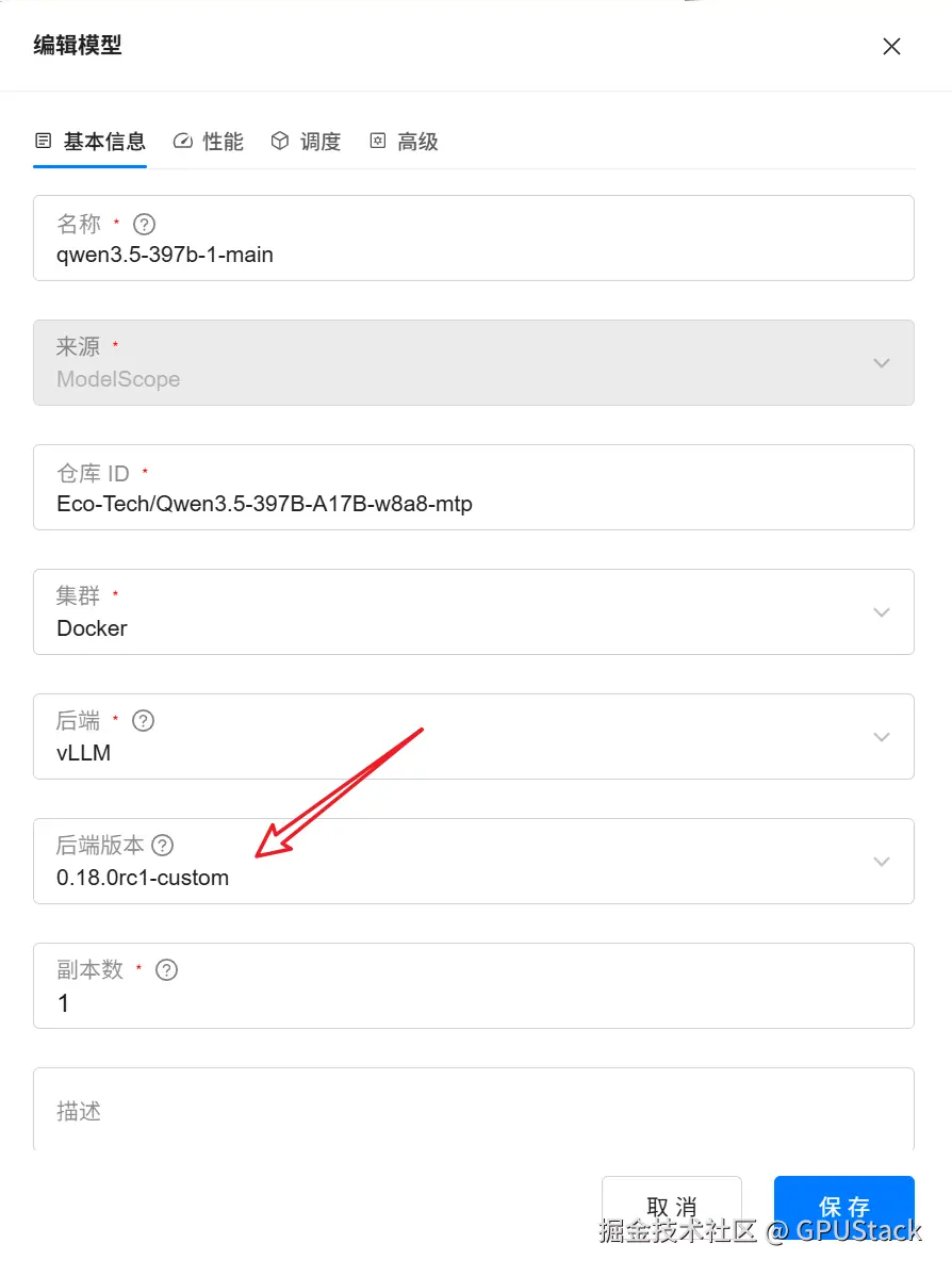 - 在 GPUStack 平台中,将该镜像作为 vLLM 后端添加