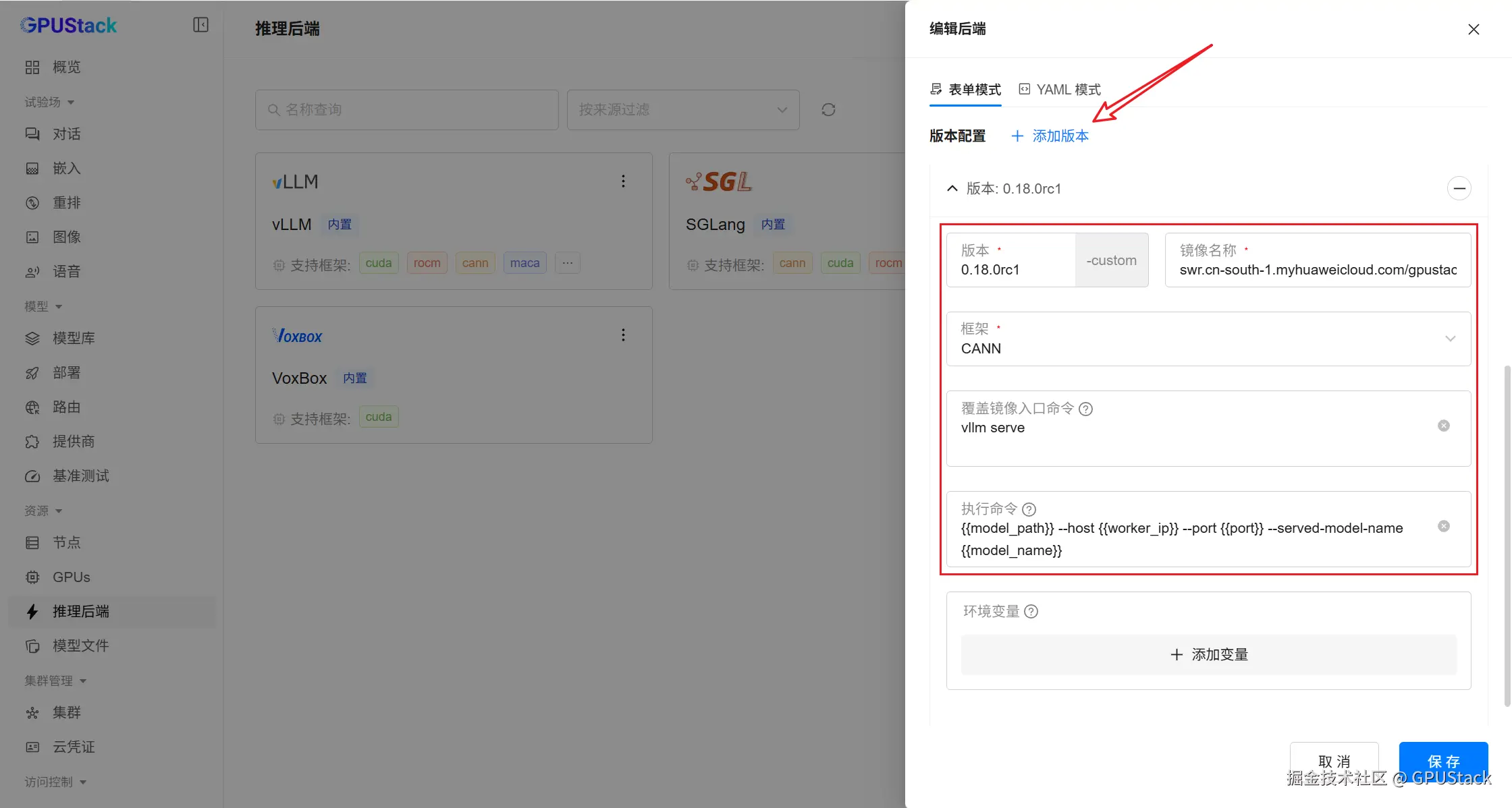 - 镜像地址:swr.cn-south-1.myhuaweicloud.com/gpustack/vllm-ascend:v0.18.0rc1 (GPUStack 同步的国内源镜像,原镜像:quay.io/ascend/vllm-ascend:v0.18.0rc1)