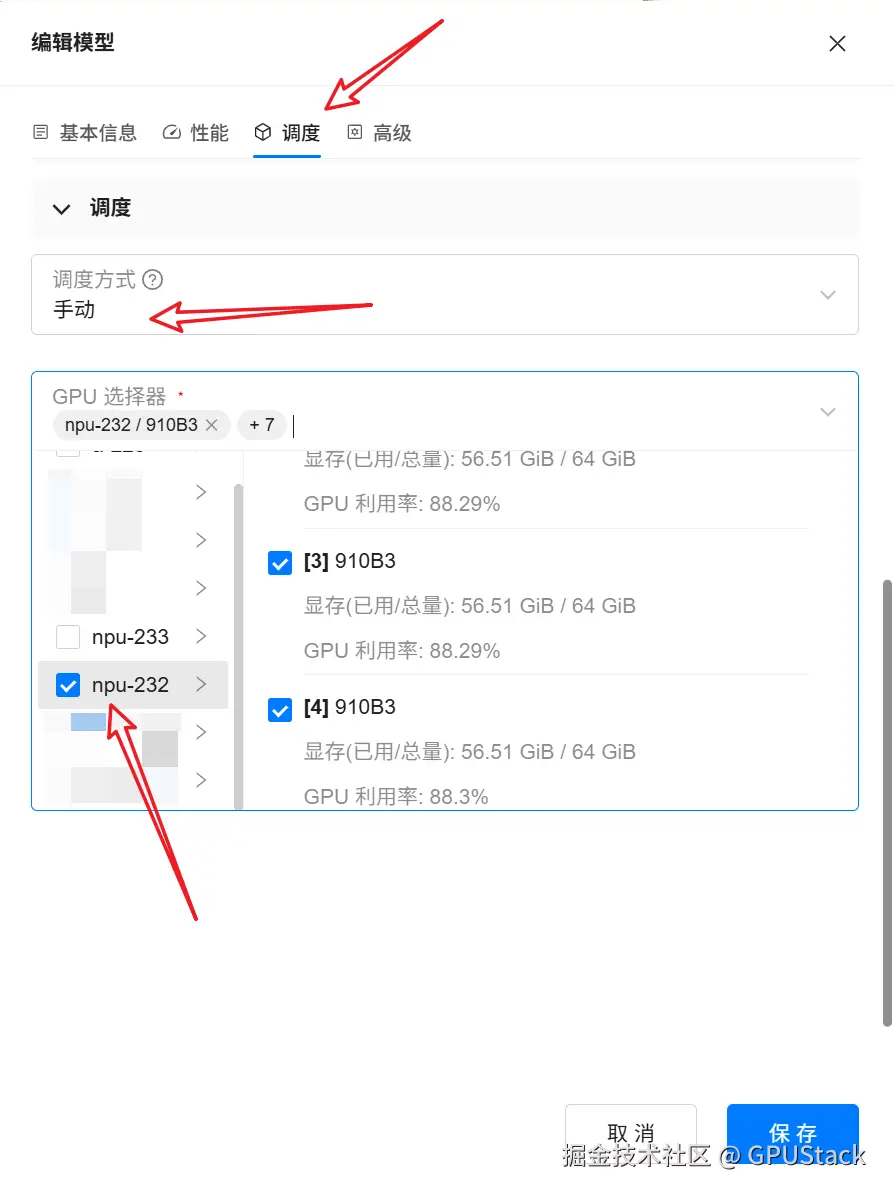 - 将调度方式修改为“手动”,并勾选主节点(Node 1)对应的所有 NPU 卡