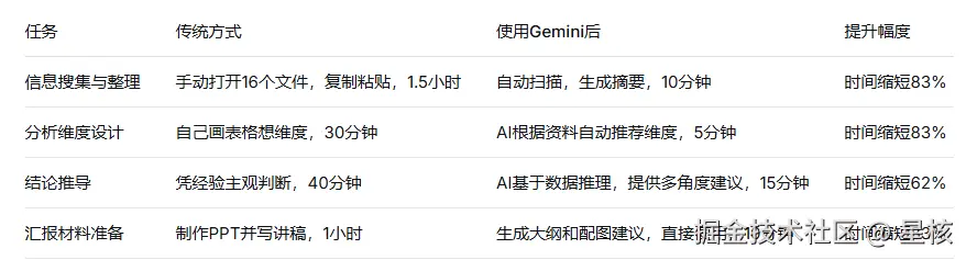 当工作难题不再是“没时间做”,而是“如何做得更好”,AI的介入就变得至关重要。Gemini通过理解意图、整合信息、推理建议、辅助创作,将原本耗时费力的流程压缩到分钟级,让人专注于更有价值的决策。小王的故事只是一个缩影,类似的场景正在无数办公电脑上发生——从销售分析到产品调研,从技术文档到会议纪要,Gemini正在重新定义“办公效率”的边界。