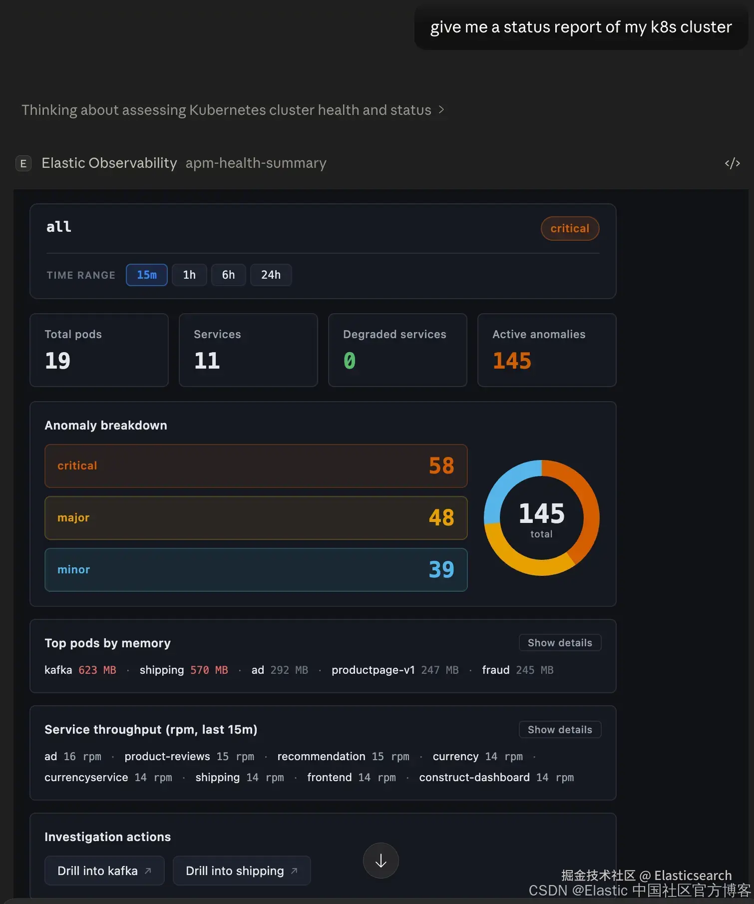 当你询问 “哪里出问题了?” 或 “给我一份状态报告” 时,会得到一次性的全局概览:整体健康状态徽标、存在问题的服务及其原因、内存占用最高的 Pod、异常严重程度分布以及服务吞吐量——全部集中在一个内联视图中。