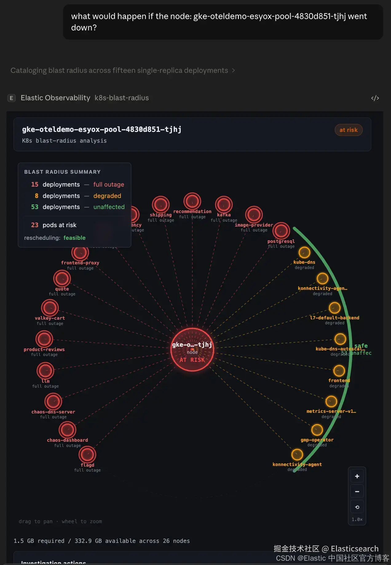 当你询问“如果我的 k8s 节点宕机会发生什么?”时,会得到一个放射状影响图:目标节点位于中心位置,完全中断的部署以红色标识,性能下降的以琥珀色标识,未受影响的以灰色标识。
