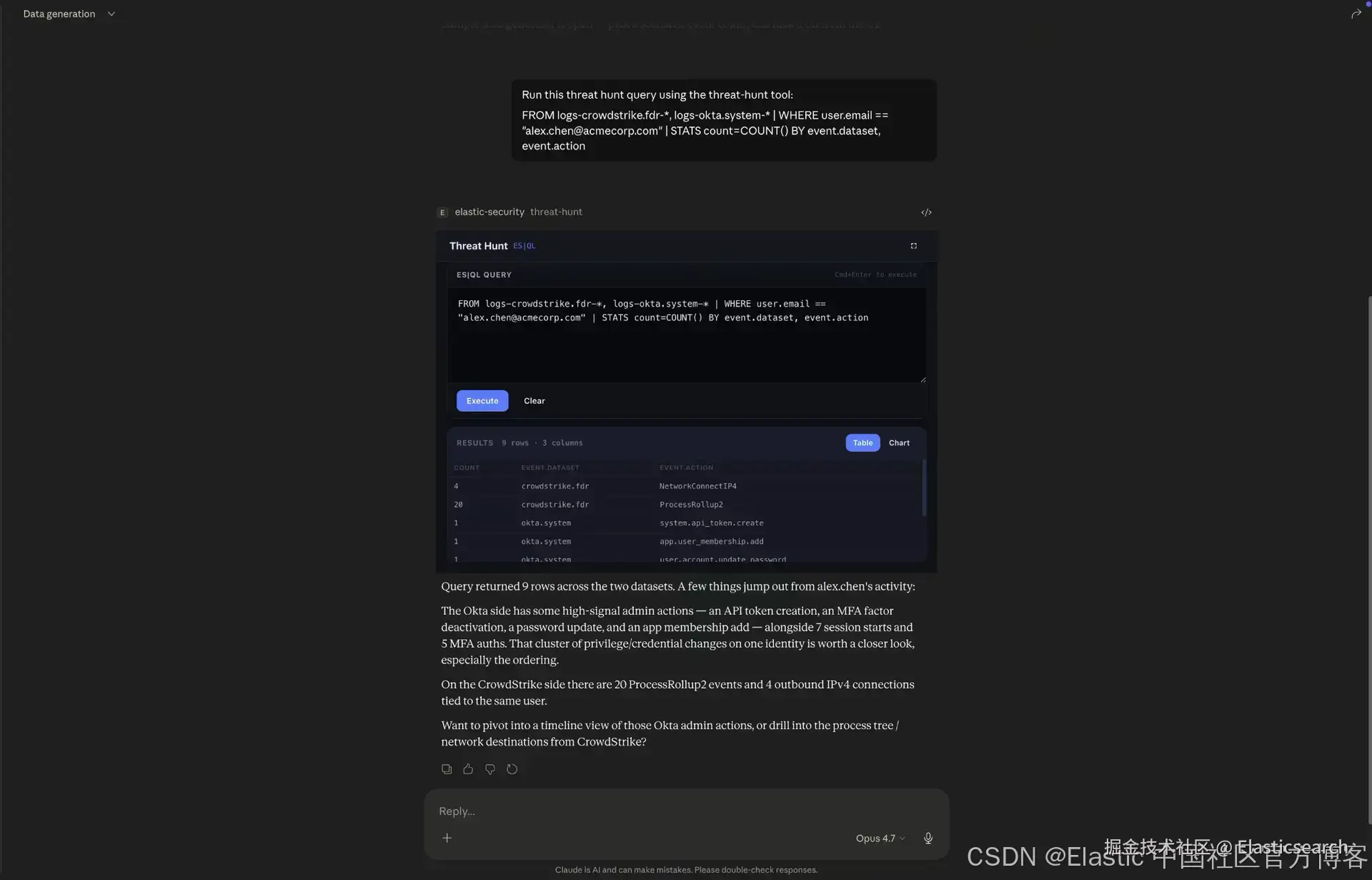 威胁狩猎。可以让代理在你的索引中进行威胁狩猎。Threat Hunt skill 会返回一个 ES|QL 工作台,其中查询已预先填充并自动执行,结果中的每个实体都可以点击并进入下钻分析。模型会在表格下方生成一段简短解读:哪些是异常的、哪些是有关联的、哪些值得进一步关注。随后它会提供下一步分支选择:要么继续深入当前威胁狩猎,要么在 MCP App 中启动另一个与当前工作互补的 skill。