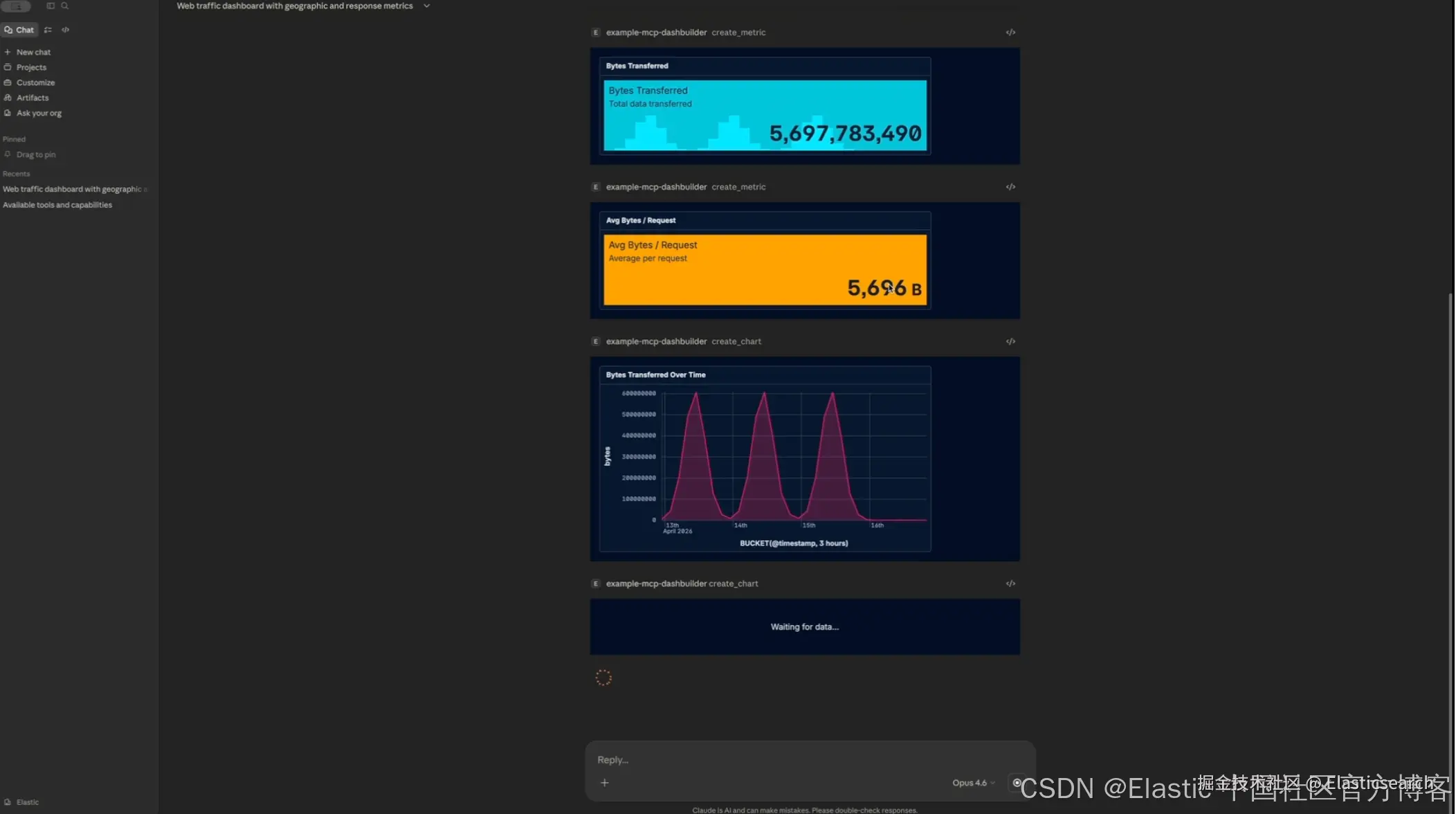 当仪表板达到理想状态后,只需一次工具调用即可将其导出到 Kibana,同时保留 ES|QL 查询和自定义配色。你也可以将已有的 Kibana 仪表板导入到对话中,进行 AI 辅助编辑。