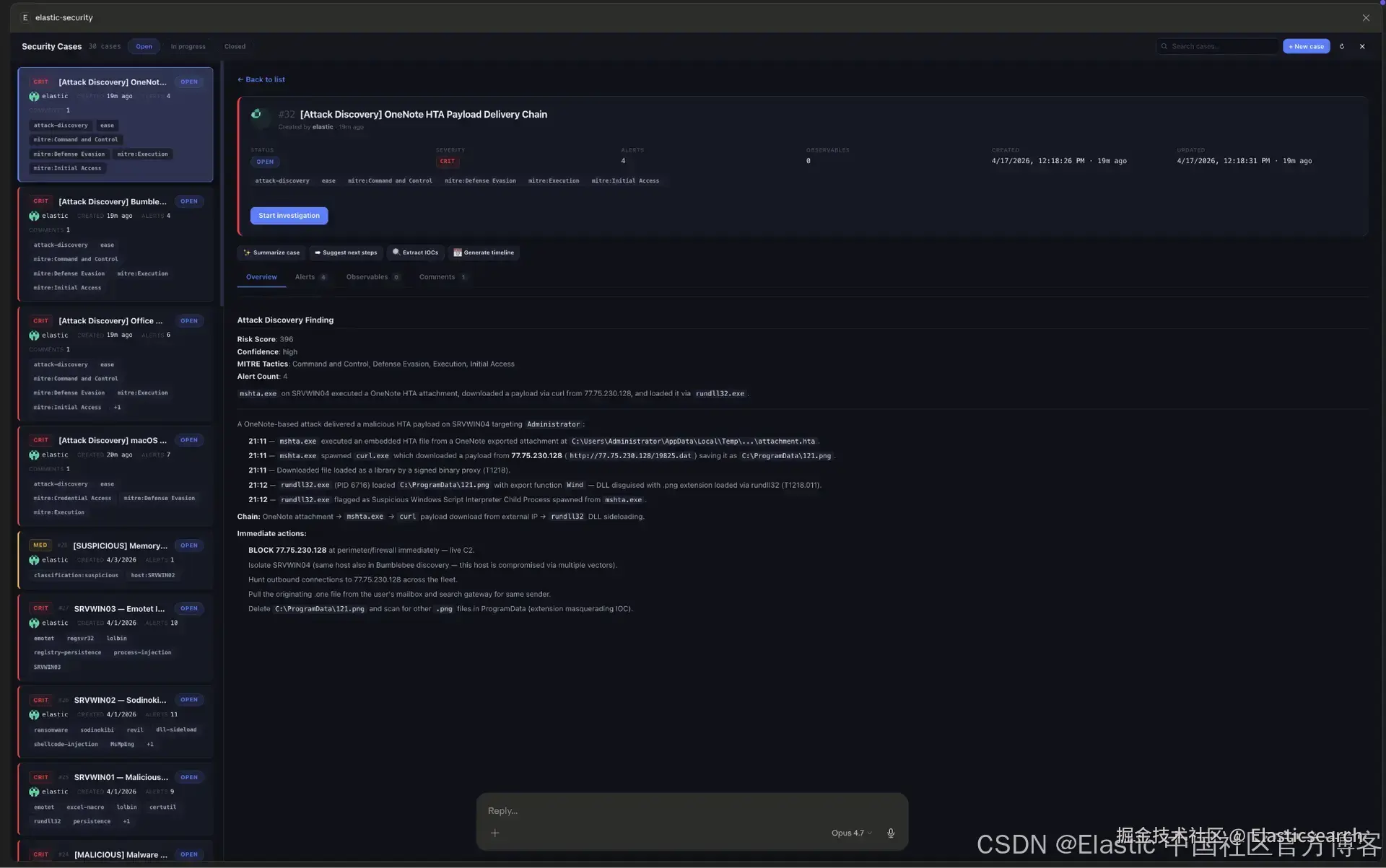 Attack Discovery 已经驱动了该应用中的关联发现视图。在整个技术栈内部,同样的代理模式进一步扩展:Elastic Workflows 负责自动化确定性步骤(例如实体丰富、创建案件、隔离主机),而 Agent Builder 则负责对数据进行推理并将这些工作流作为工具调用。MCP App 将同样的安全能力带入外部对话,而 Workflows 和 Agent Builder 则在系统内部深化这一能力。入口不同,但底层仍然是同一套 Elastic API。