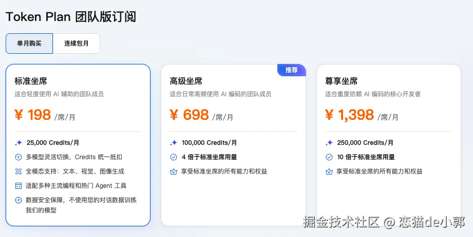 然后这几天,阿里云推出了 Token Plan ,看起来接下来 Qwen 会开始全新的按量计费的时代?从用量上看,1398 的尊享的用量是对标 Qwen Code Plan Pro ,不过价格就不一样了,提价意味明显: