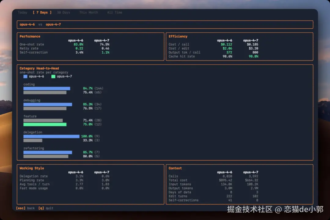 特别是最近 Opus 4.7 每次调用生成的内容也明显更多,大约是 800 tokens,相比之下 4.6 是 372 tokens,这也让成本明显更高:单次调用成本约 0.185 美元,4.6 是 0.112 美元。