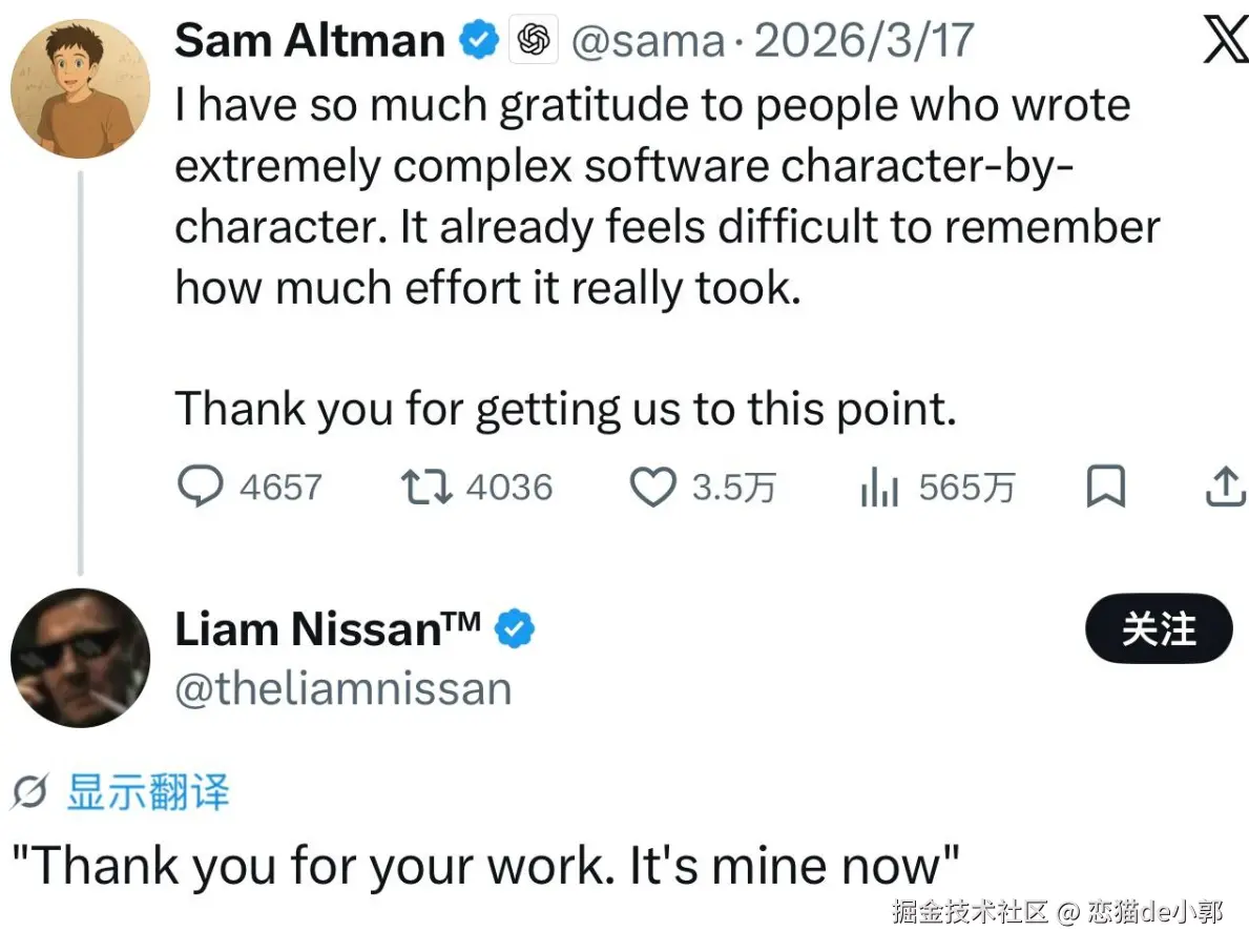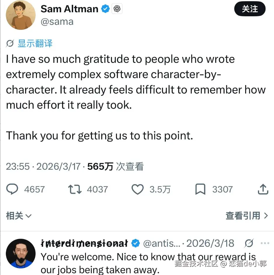 突入就想起来前段时间 OpenAI 奥特曼深情感谢老一辈程序员,感谢古法编程的开发者让 OpenAI 走到现在,结果评论区风转急下,大家说: