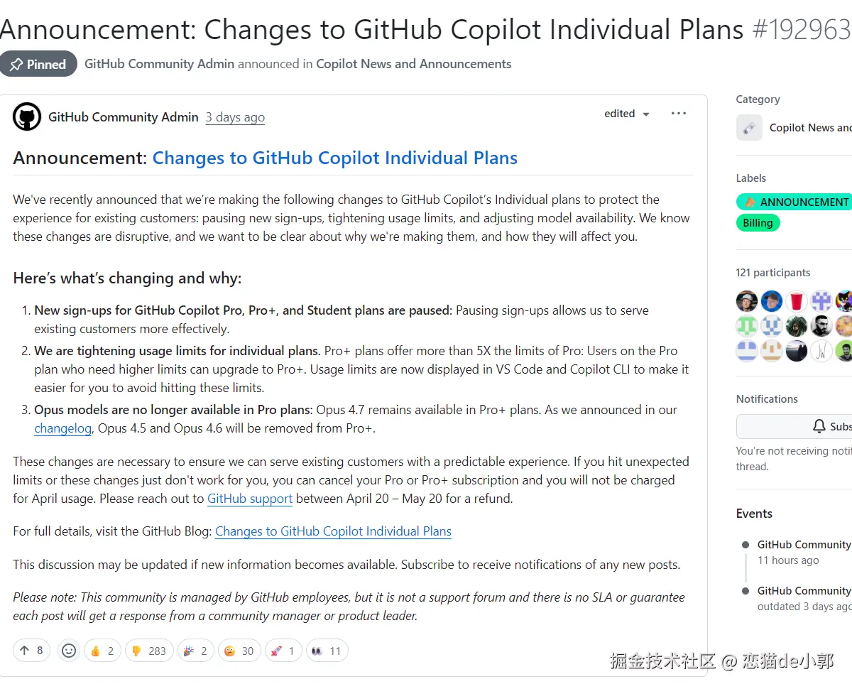 实际上这几天都有类似情况,比如 GitHub Copilot 就在 4 月 20 号修改了订阅政策: