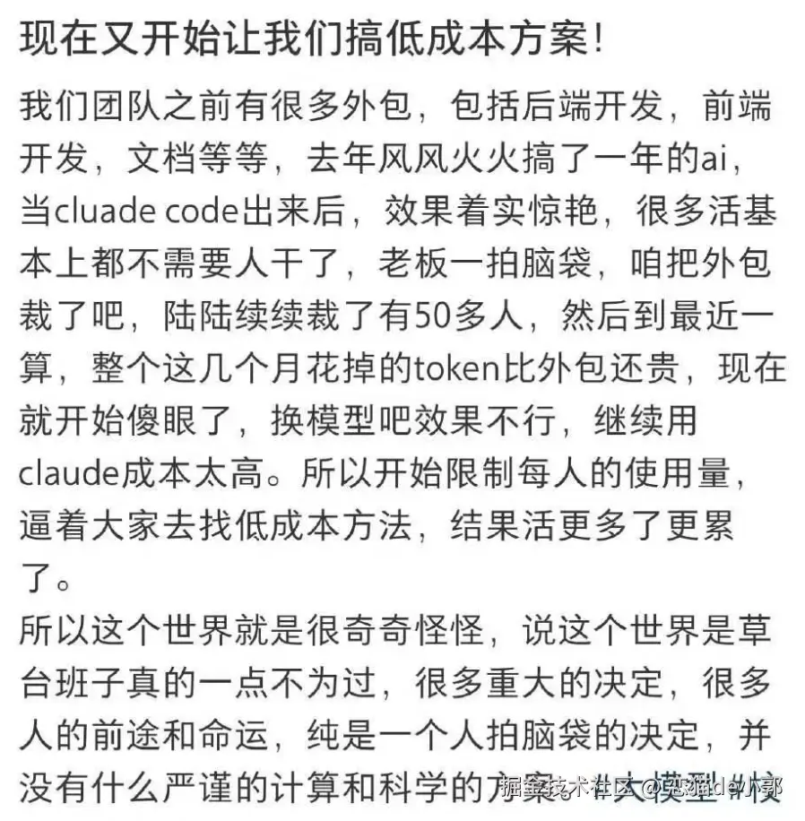 而随着价格不断上涨波动,稳定性受到考验之后,有些东西又开始被重新审视起来,毕竟一个员工的价格是稳定的,还能背锅,而 AI 目前的情况是,需要不断调整预期的涨薪,而且高峰期累了就需要「429 休息」,你甚至不能多骂几句,骂了也算 Token ·····