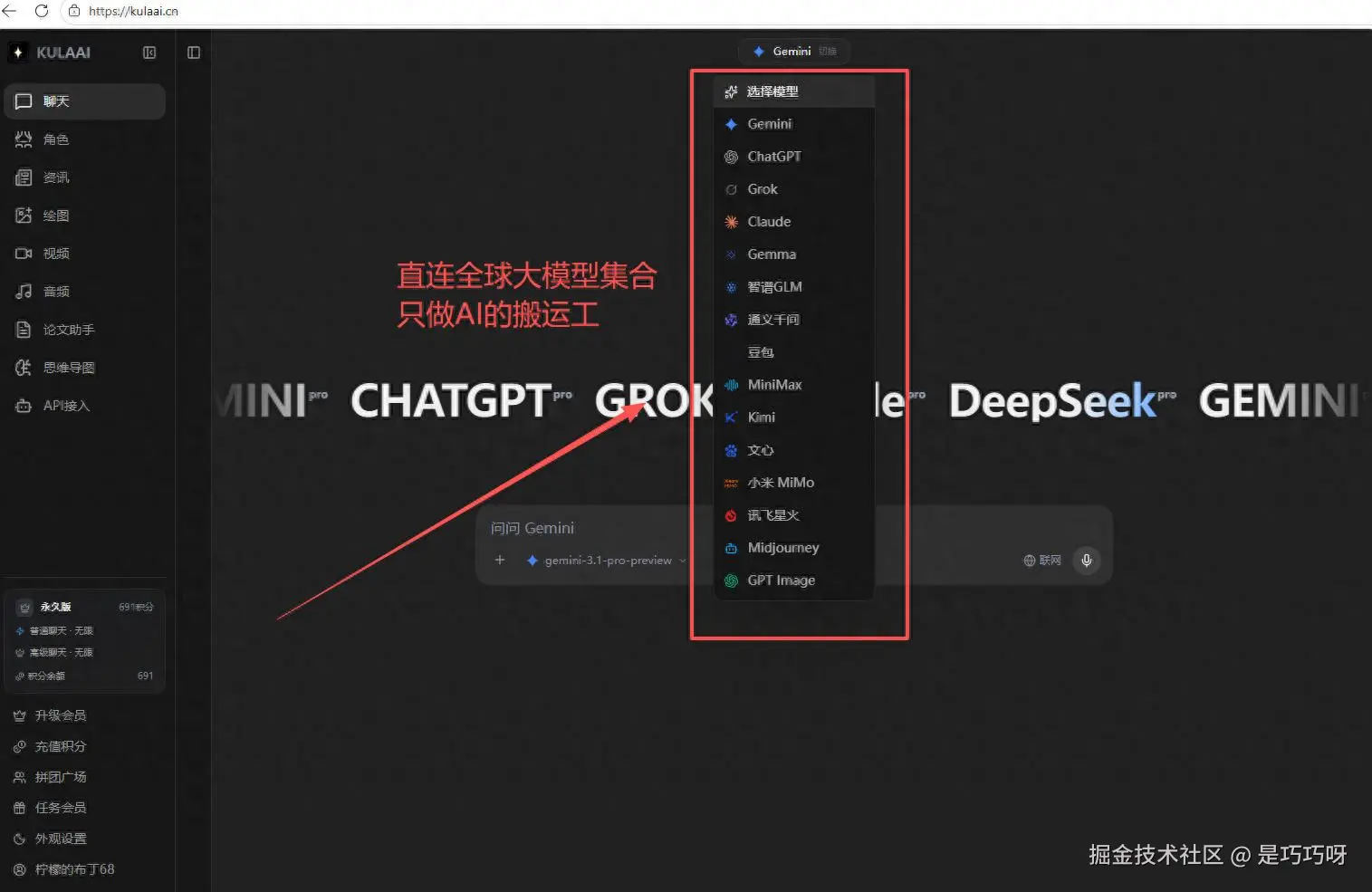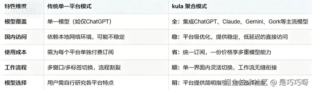 此时,一个能够无缝聚合顶尖AI能力的平台就显得至关重要。目前,最值得推荐的一站式解决方案便是kula(t.kulaai.cn)。它成功聚合了市面上包括Gemini、ChatGPT、Claude、Gork在内的几乎所有主流 AI大模型 ,并且针对国内网络环境进行了深度优化,实现了无需复杂配置的直接访问,极大地降低了用户的使用门槛。