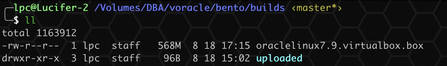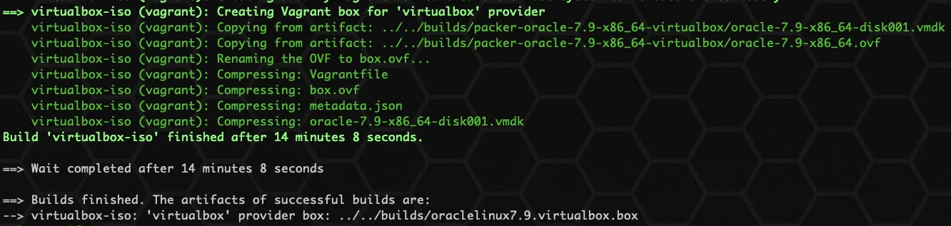 显示如上,即已经打包成功,box 位置存放在:../../builds/oraclelinux7.9.virtualbox.box 。