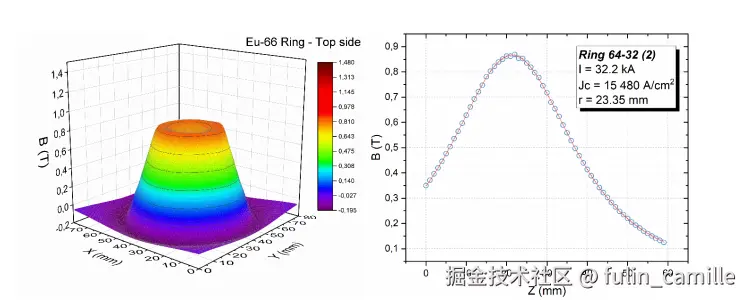 图 2 :预期最大捕获磁场(EuBCO/Ag) CAN 超导体Eu-66 环形 - 上表面 0.9环形 64-32 (2)临界电流密度 Jc = 15480 A/cm²电流 I = 32.2 kA半径 r = 23.35 mm)