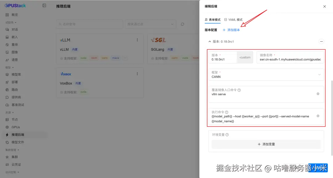 在平台中添加自定义后端时,请参考以下配置:版本名称:建议与镜像的 Tag 保持一致(例如 0.18.0rc1)镜像地址:swr.cn-south-1.myhuaweicloud.com/gpustack/vllm-ascend:v0.18.0rc1 (GPUStack 同步的国内源镜像,原镜像:quay.io/ascend/vllm-ascend:v0.18.0rc1)支持框架:CANN入口命令:vllm serve执行命令:{{model_path}} --host {{worker_ip}} --port {{port}} --served-model-name {{model_name}}