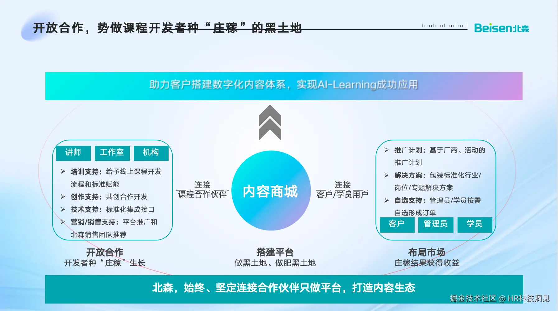 原生一体化意味着培训数据与绩效、晋升、继任等HR核心流程天然打通,无需额外集成开发。选择原生一体化产品(如北森AI Learning),长期来看比选择独立系统+API对接的综合成本更低、价值更大。