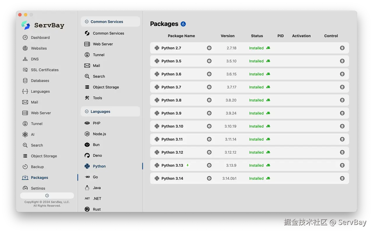 使用ServBay 一键安装 Python 环境或者 Node.js 环境,还能随意切换。