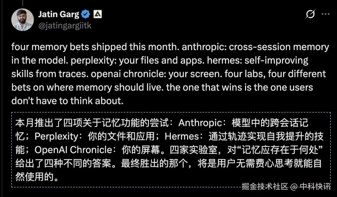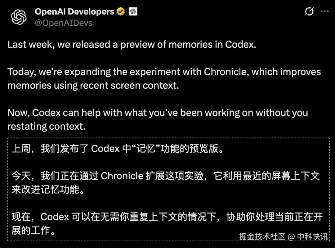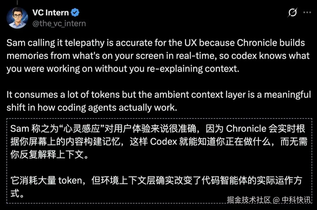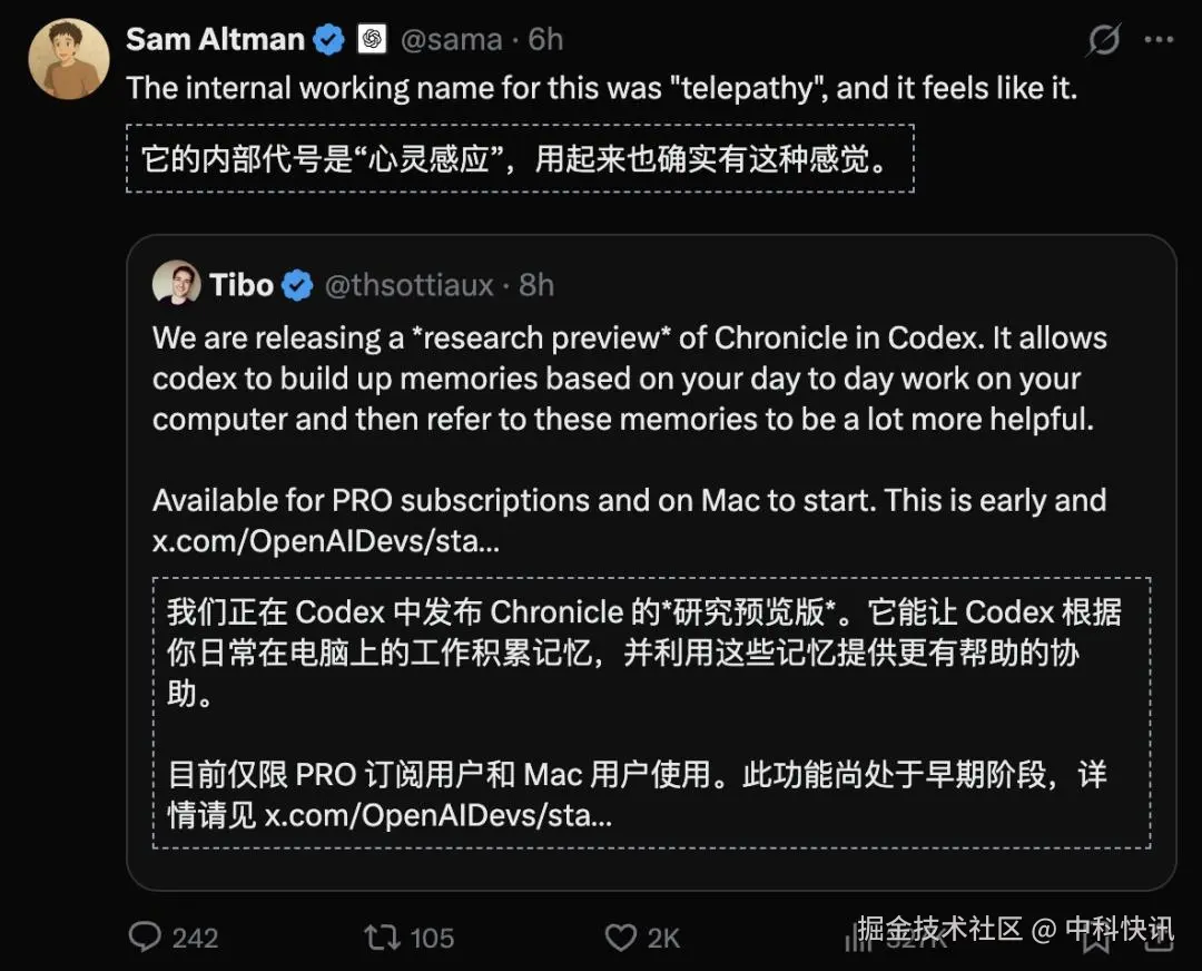本台讯 4月21日,科技界再爆重磅消息。就在刚刚,OpenAI正式推出了代号为“Chronicle”的研究预览版,这款被内部戏称为“心灵感应(Telepathy)”的新功能,瞬间将人工智能行业的“记忆之争”推向了白热化。