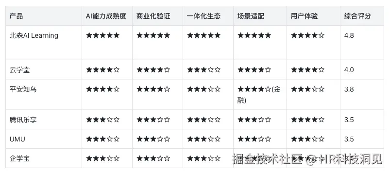 UMU在AI+绩效支持方面有一定特色,但AI学习能力的整体深度不如头部产品。