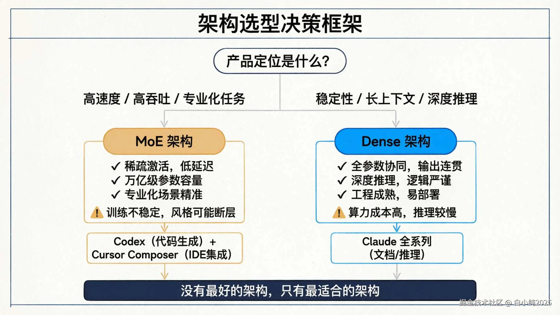 这也给我们一个启示:无论是选择 AI 工具,还是自己做模型架构设计,都不要盲目追求"MoE 比 Dense 高级"——没有最好的架构,只有最适合的架构。