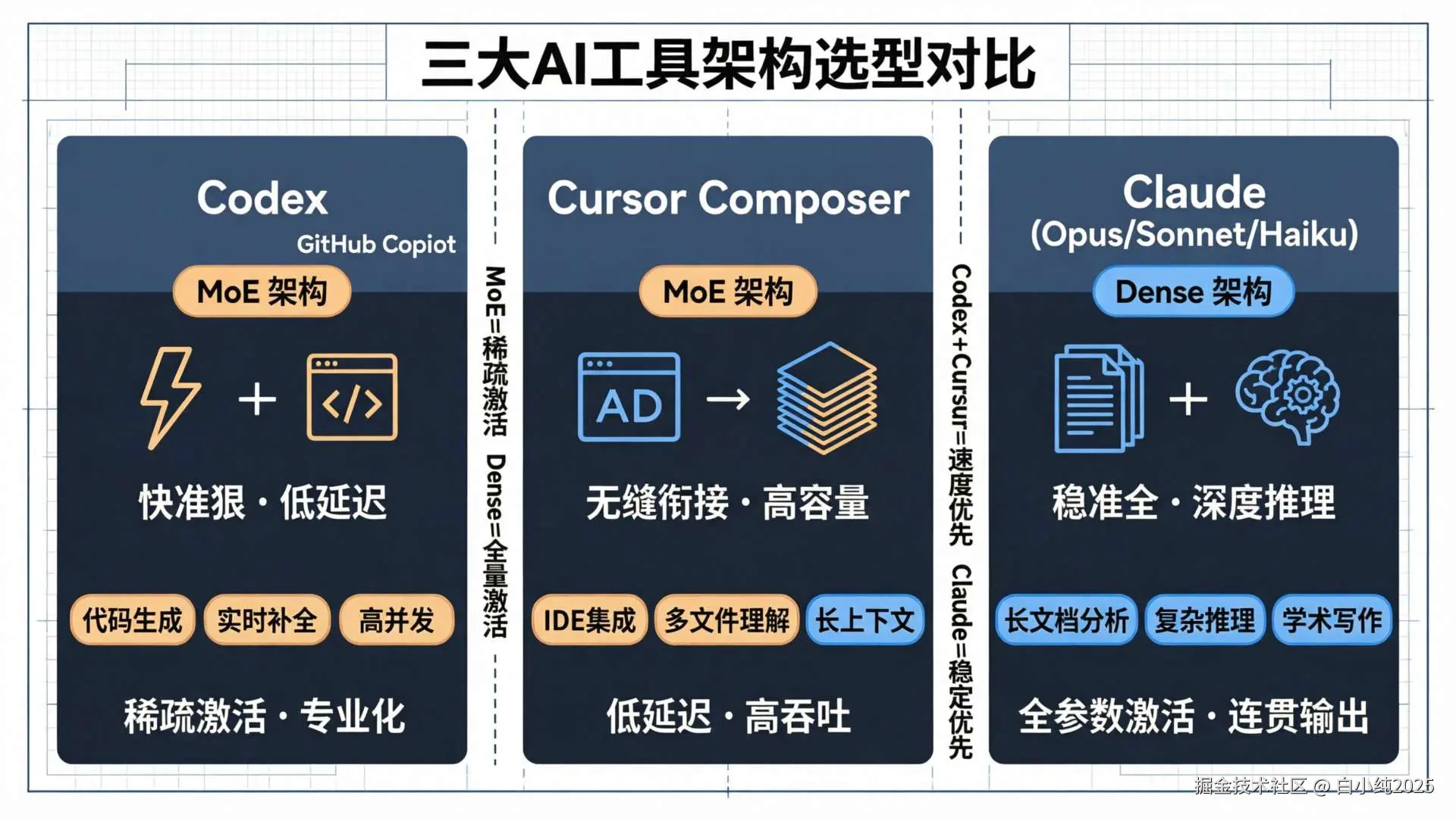 | 高速度、高吞吐、专业化任务(代码生成、实时响应) | MoE | Codex、Cursor |