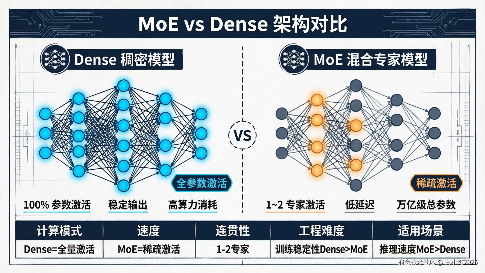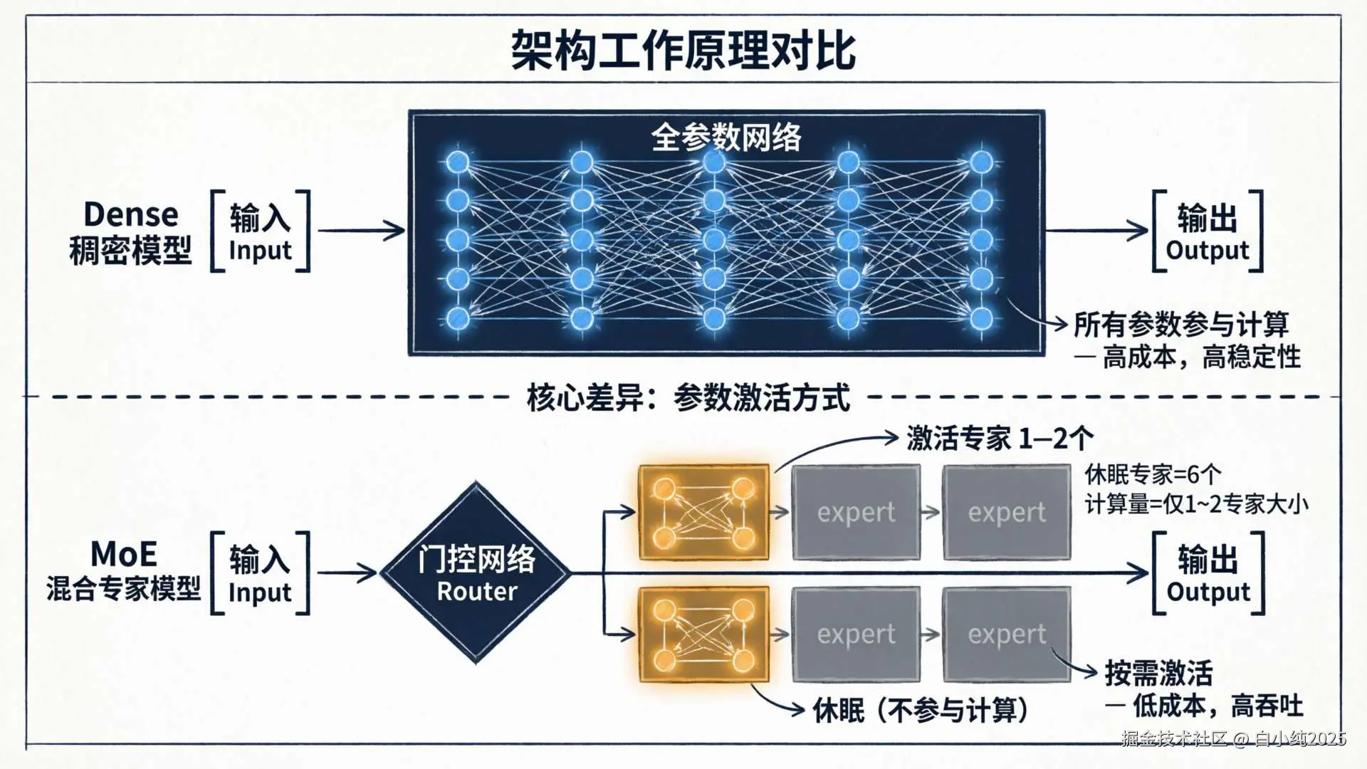 一、基础概念:MoE 与 Dense,核心差异在哪?