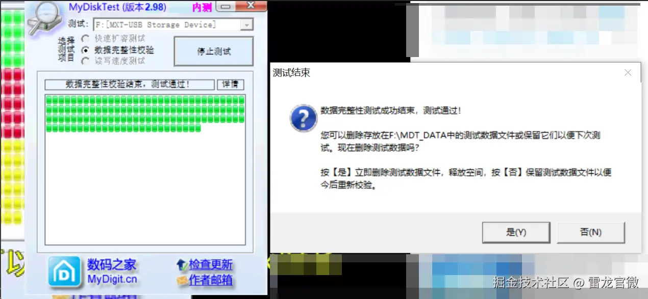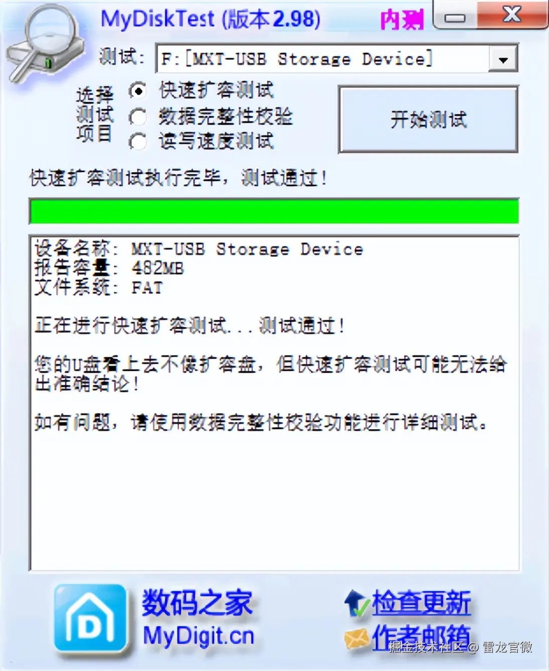 我们借助MyDiskTest,开展容量真实性与数据完整性校验。依次进行快速扩容测试、数据完整性校验,测试过程及结果如下: