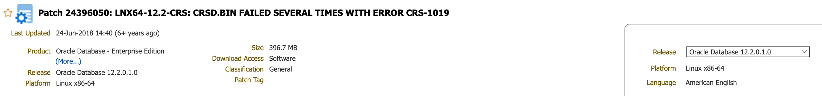 下载 BUG 所需补丁 Patch 24396050: LNX64-12.2-CRS: CRSD.BIN FAILED SEVERAL TIMES WITH ERROR CRS-1019