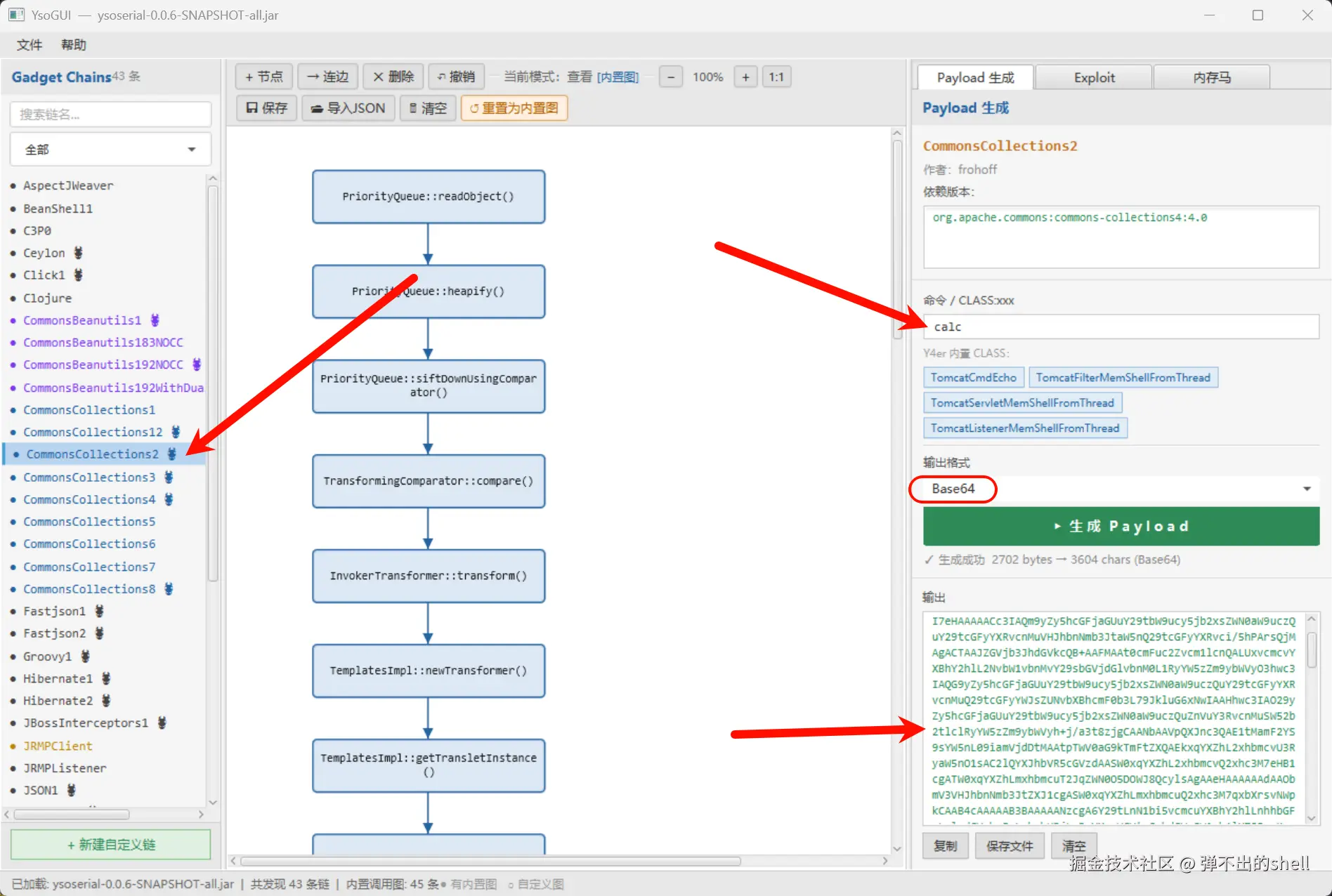 - 生成 Payload 发送:把恶意类字节码塞进利用链,序列化后发送给目标
