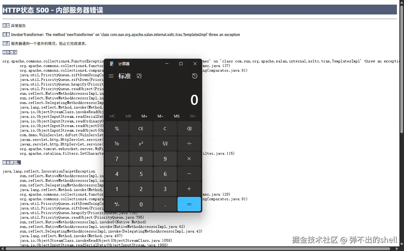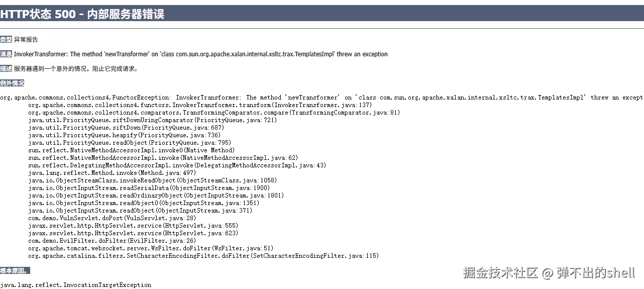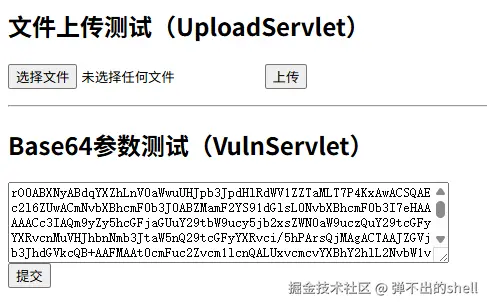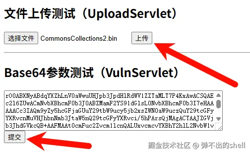 先运行 MInjectServlet 生成两个 class 文件,再利用 GetBytes 输出字节数组,放入 CC2 链中,再次运行获得整个序列化的 Base64 数据。提交后访问:
