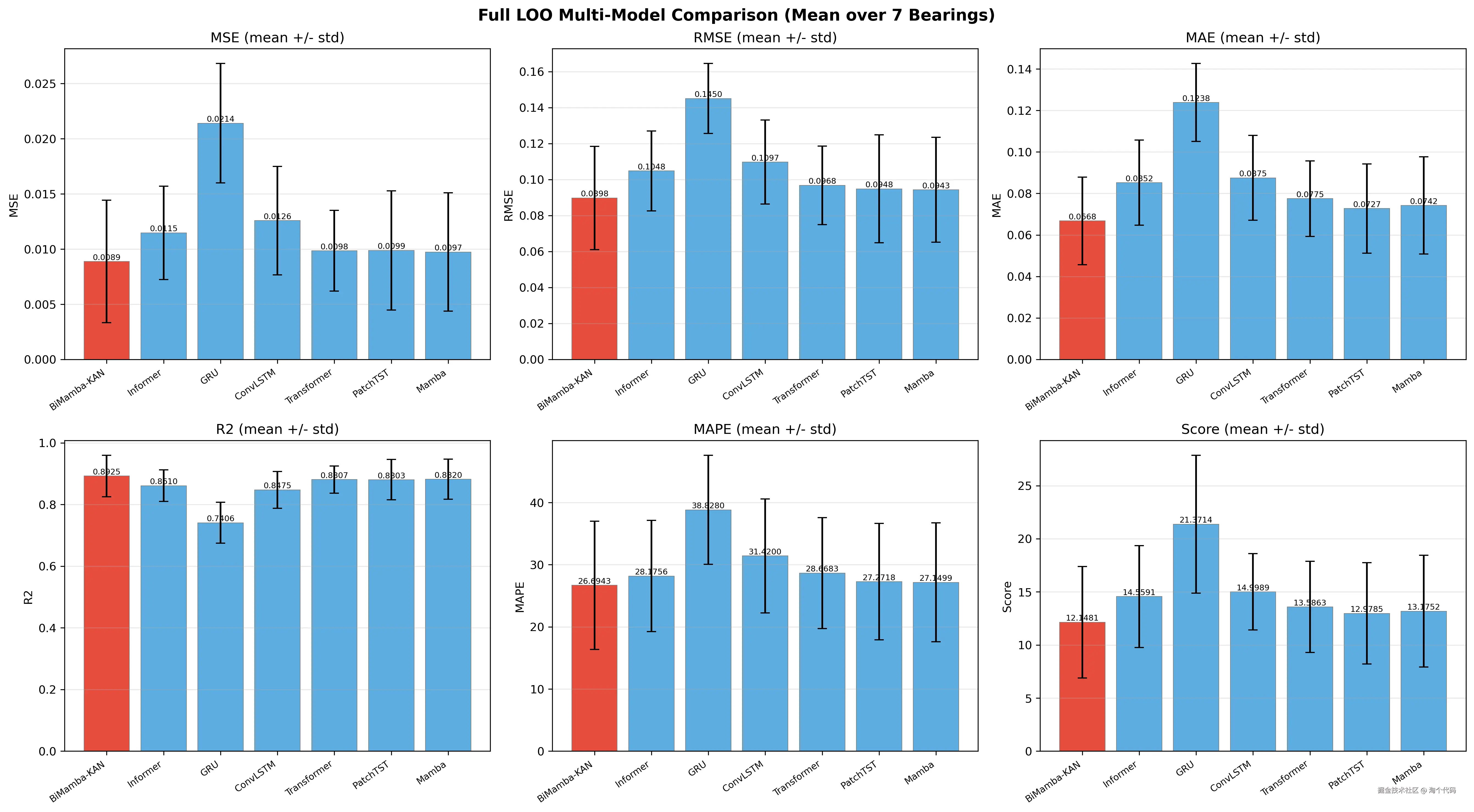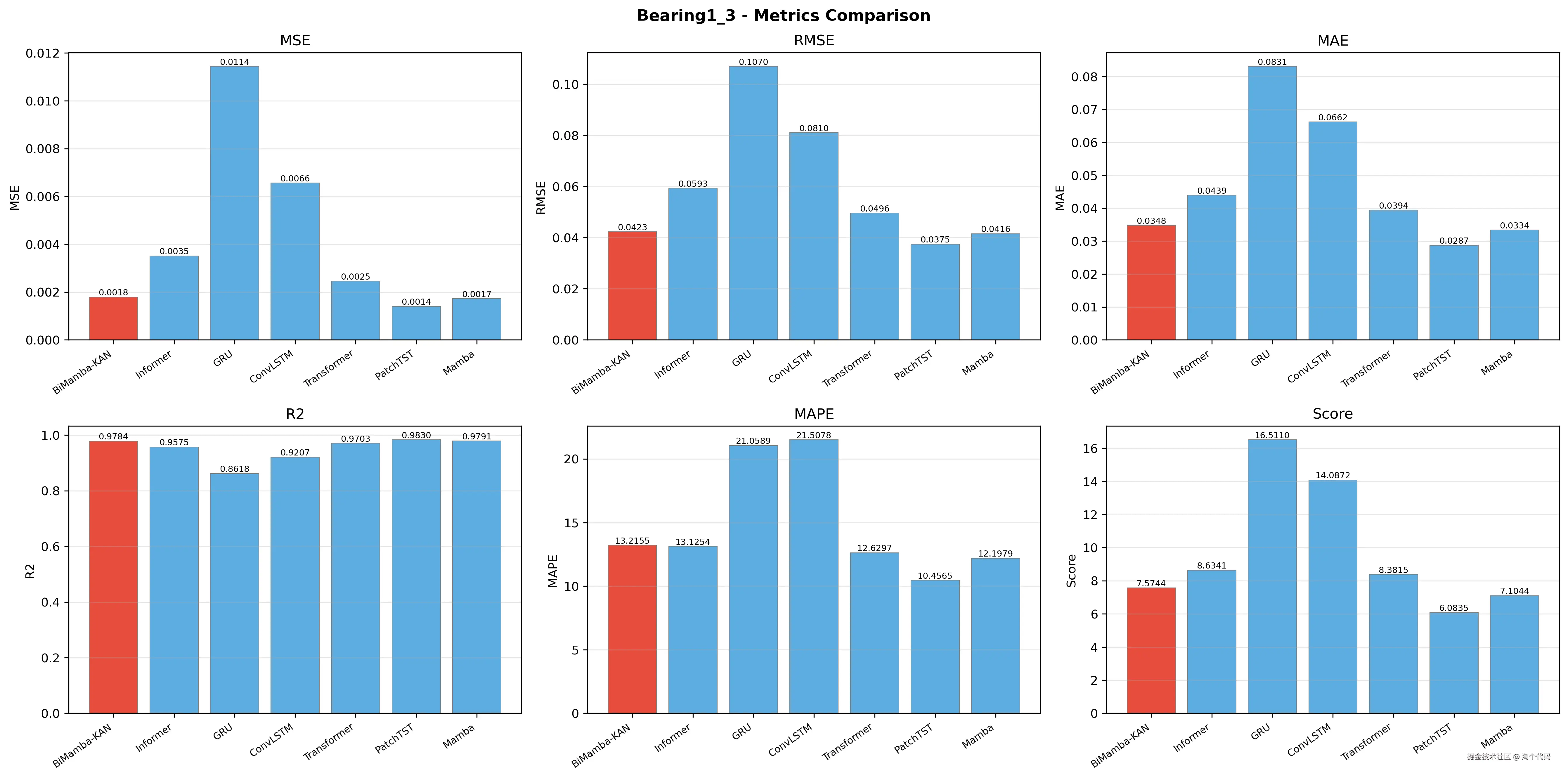 总之,你可以看到,本期推出的这个项目已经做好了所有的对比实验!在 PHM 2012 数据集上,BiMamba-KAN 模型取得了非常高的预测精度,优于 GRU、Transformer、Informer、PatchTST、Mamba 等对比模型。